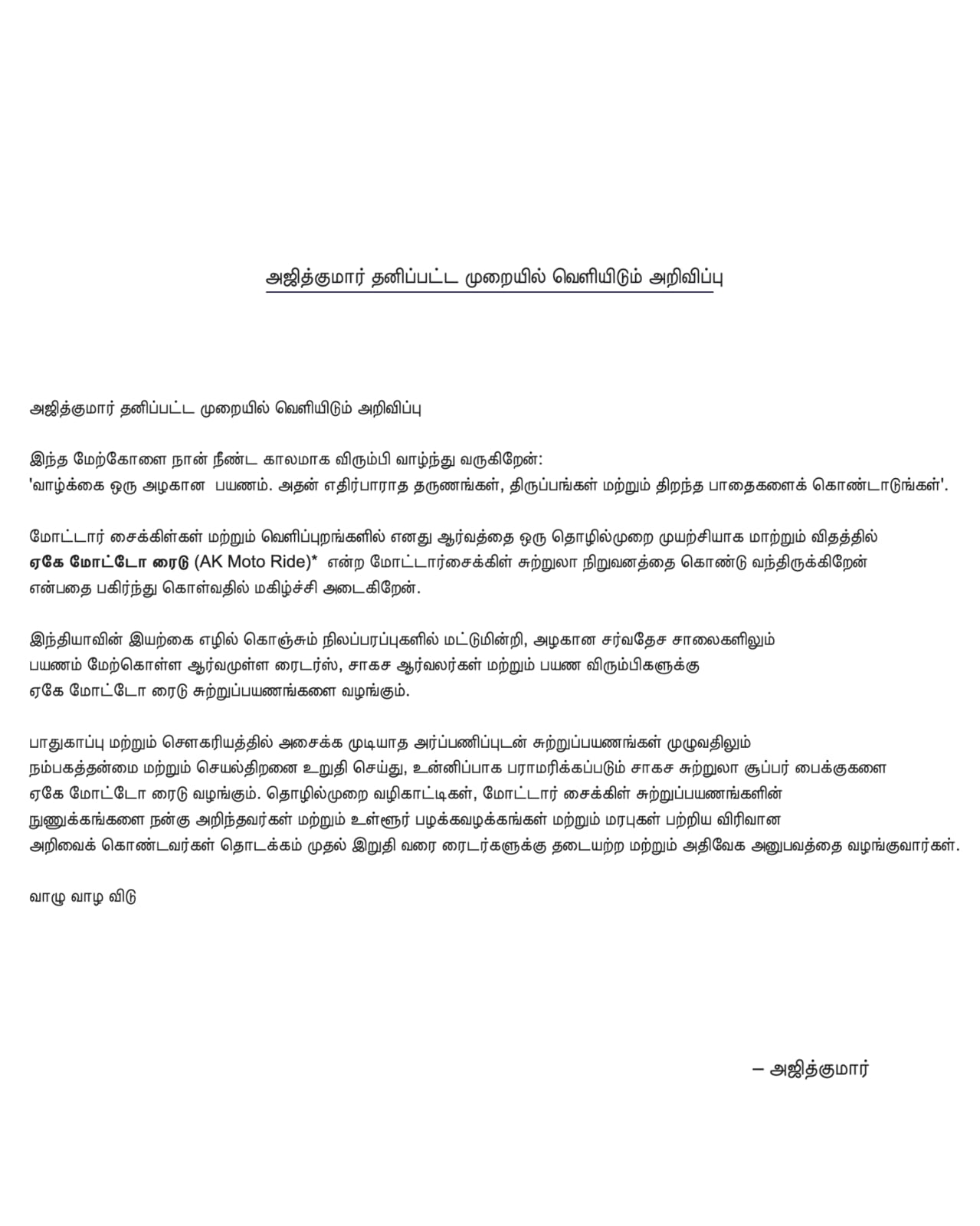 மோட்டார் சைக்கிள்கள் மற்றும் வெளிப்புறங்களில் எனது ஆர்வத்தை ஒரு தொழில்முறை முயற்சியாக மாற்றும் விதத்தில் *ஏகே மோட்டோ ரைடு (AK Moto Ride)* என்ற மோட்டார்சைக்கிள் சுற்றுலா நிறுவனத்தை கொண்டு வந்திருக்கிறேன் என்பதை பகிர்ந்து கொள்வதில் மகிழ்ச்சி அடைகிறேன்.