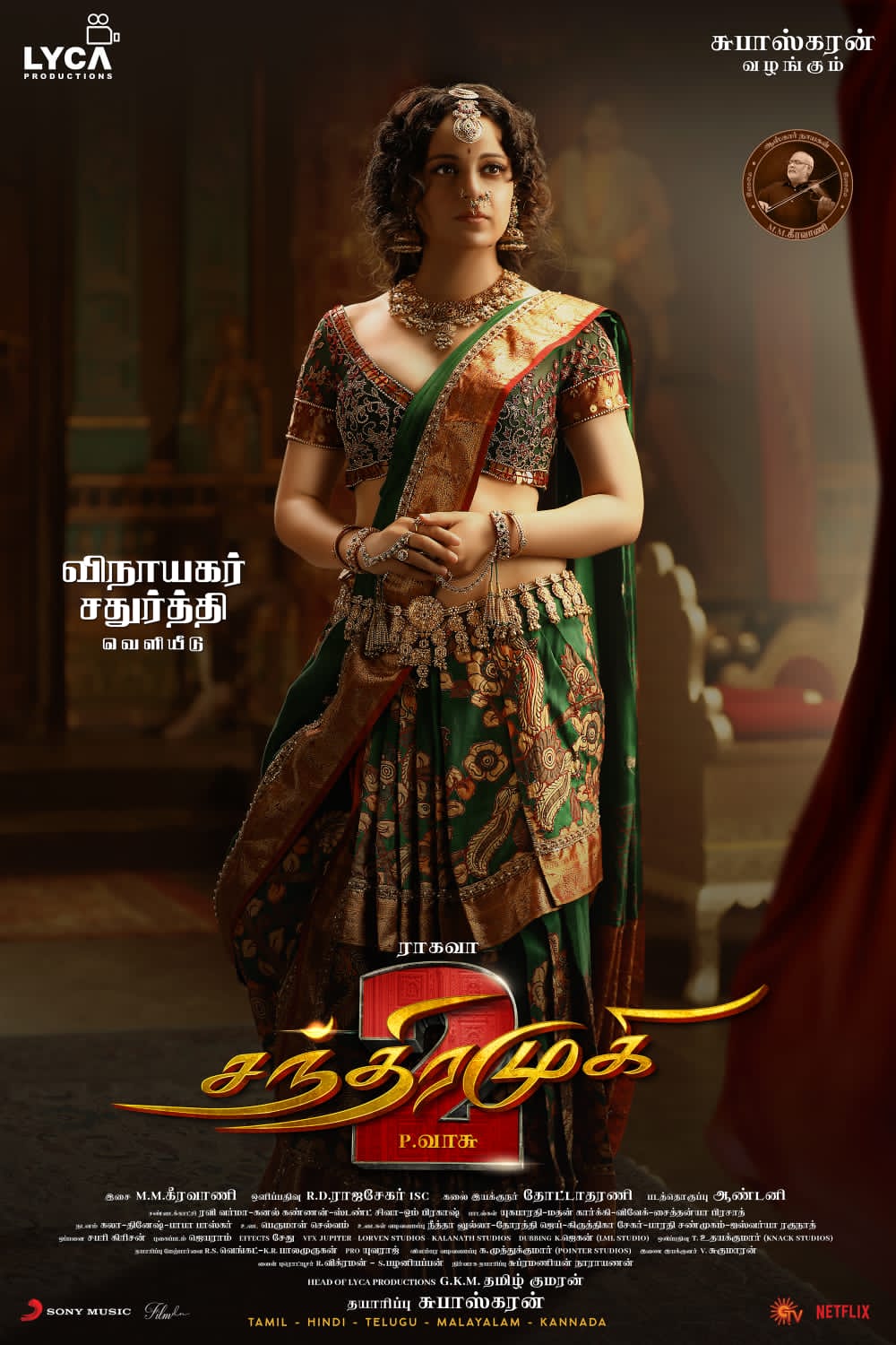 தமிழ் திரையுலகில் முன்னணி நட்சத்திங்கள் மற்றும் கலைஞர்களின் உருவாக்கத்தில், பல ப்ளாக்பஸ்டர் படங்களை தொடர்ந்து வழங்கி வரும் முன்னணி தயாரிப்பு நிறுவனம் லைக்கா புரொடக்ஷன்ஸ். பல பிரமாண்ட படங்களை தயாரித்து வரும், லைக்கா புரொடக்ஷன்ஸ் சார்பில் தயாரிப்பாளர் சுபாஷ்கரன் தயாரிப்பில், இயக்குநர் பி. வாசுவின் இயக்கத்தில் உருவாகி, பெரும் எதிர்பார்ப்பில் இருக்கும் திகில்- காமெடி திரைப்படமான ‘சந்திரமுகி 2’ படத்திலிருந்து, சந்திரமுகியாக நடிக்கும் நடிகை கங்கனா ரனாவத்தின் ஃபர்ஸ்ட் லுக் வெளியாகியுள்ளது.