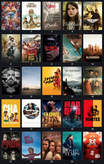 உலக அரங்கில் வெளியான படங்களை லெட்டர்பாக்ஸ்டு என்ற இணையதளம் தரவரிசைப்படுத்தியுள்ளது. இந்த ஆண்டு முதல் ஆறு மாதங்களில் வெளியான படங்களை அந்நிறுவனம் தரவரிசைப்படுத்தியுள்ளது.
