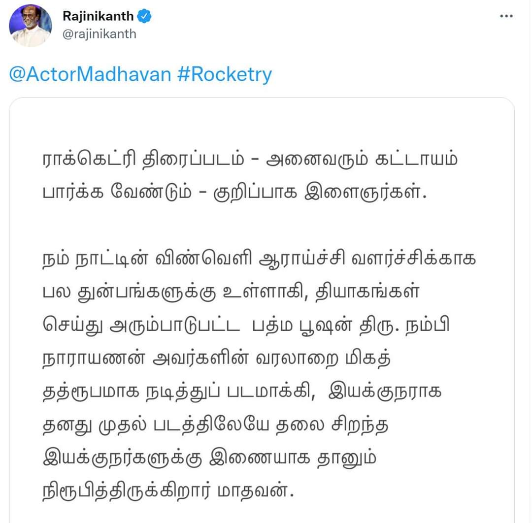 ராக்கெட்ரி திரைப்படம் – அனைவரும் கட்டாயம் பார்க்க வேண்டும் – குறிப்பாக இளைஞர்கள் . நம் நாட்டின் விண்வெளி ஆராய்ச்சி வளர்ச்சிக்காக பல துன்பங்களுக்கு உள்ளாகி , தியாகங்கள் செய்து அரும்பாடுபட்ட பத்ம பூஷன் நம்பி நாராயணன் அவர்களின் வரலாறை மிகத் தத்ரூபமாக நடித்துப் படமாக்கி , இயக்குநராக தனது முதல் படத்திலேயே தலை சிறந்த இயக்குநர்களுக்கு இணையாக தானும் நிரூபித்திருக்கிறார் மாதவன். இப்படி ஒரு திரைப்படத்தைக் கொடுத்ததற்காக அவருக்கு என்னுடைய நன்றிகளும் , பாராட்டுக்களும் என்று தெரிவித்துள்ளார்.