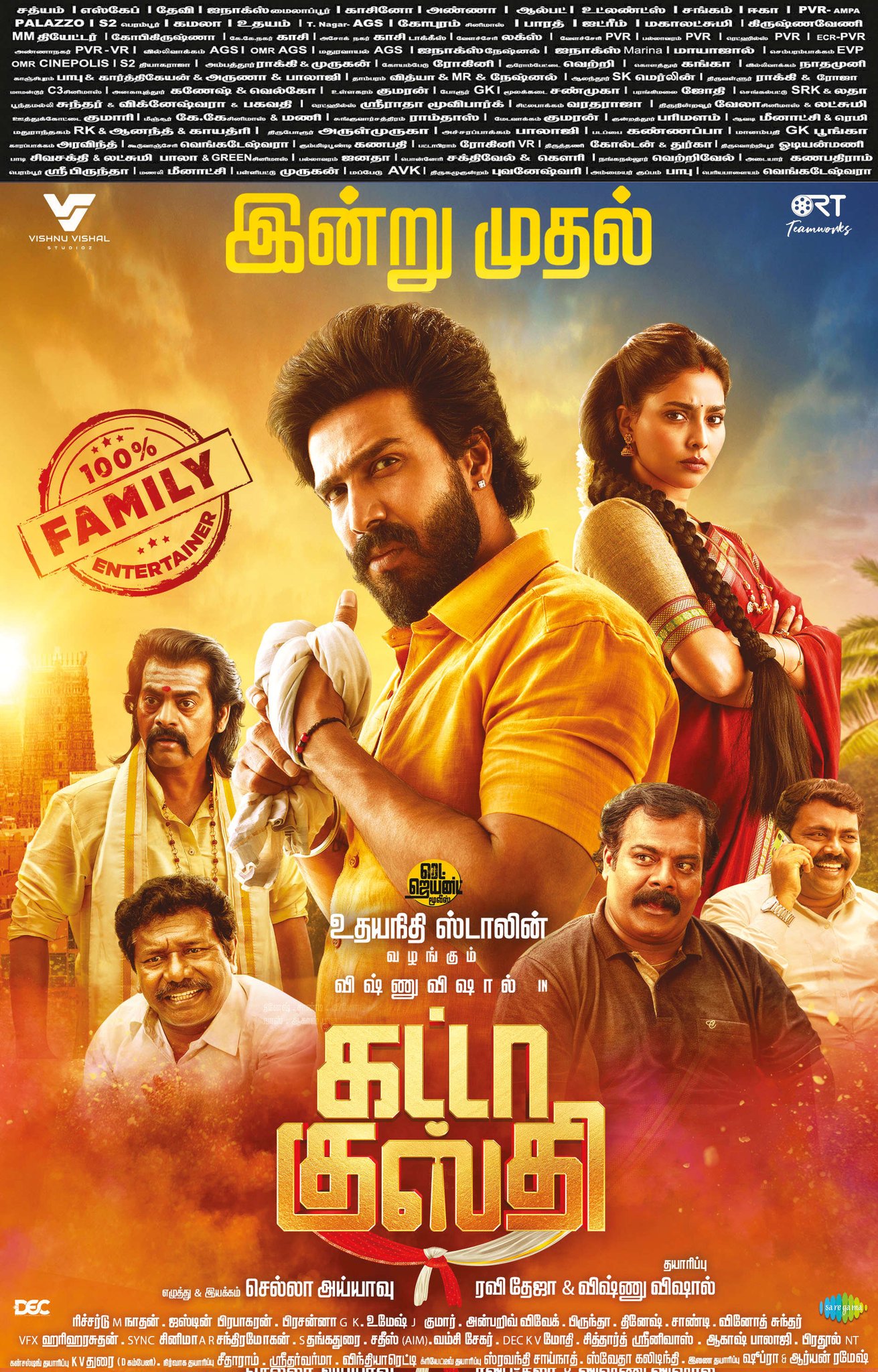 செல்லா அய்யாவு இயக்கத்தில் விஷ்ணு விஷால், ஐஸ்வர்யா லட்சுமி உள்ளிட்டோர் நடித்துள்ள திரைப்படம் கட்டா குஸ்தி. இந்த வார ரிலீஸில் மிக சிறந்த பொழுதுபோக்கு படமாக வந்துள்ளது. இந்த படத்தில் விஷ்ணு விஷால், ஐஸ்வர்யா லட்சுமி, கருணாஸ், காளி வெங்கட், முனீஸ்காந்த், ரெடின் கிங்ஸ்லி மற்றும் பலர் நடிப்பில் செல்லா அய்யாவு இயக்கத்தில் ரிச்சர்ட் எம். நாதன் ஒளிப்பதிவில் ஜஸ்டின் இசையில் வெளிவந்து இருக்கும் படம் .